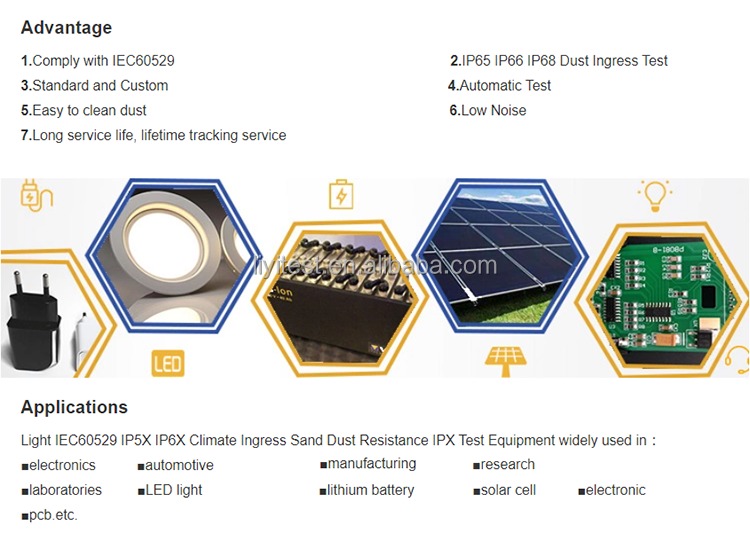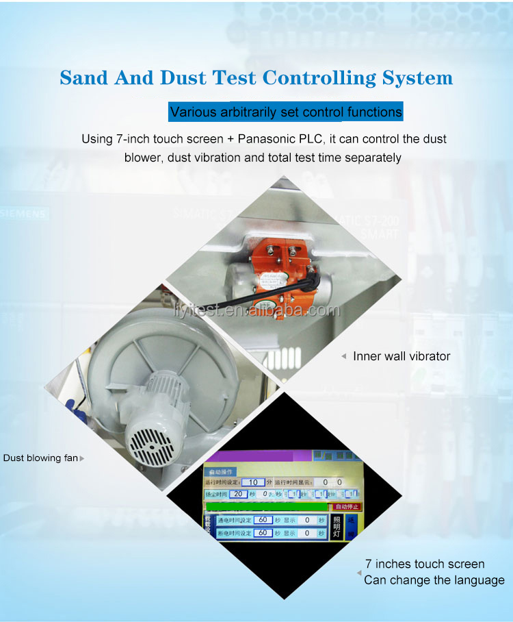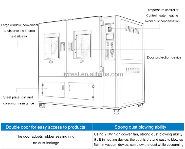 The LIYI Simulated Sand and Dust Test Chamber is engineered according to GB4706, GB2423, GB7000.1, IEC60529 standards and meets IPX3 and IPX4 dust test requirements. This instrument is ideal for testing control cabinets, household appliances, low voltage electric appliances, automobiles, lamps and lanterns, motorcycle parts, and other outer shells. The chamber maintains constant or variable pressure and is suitable for indoor low-concentration dust pollution tests.